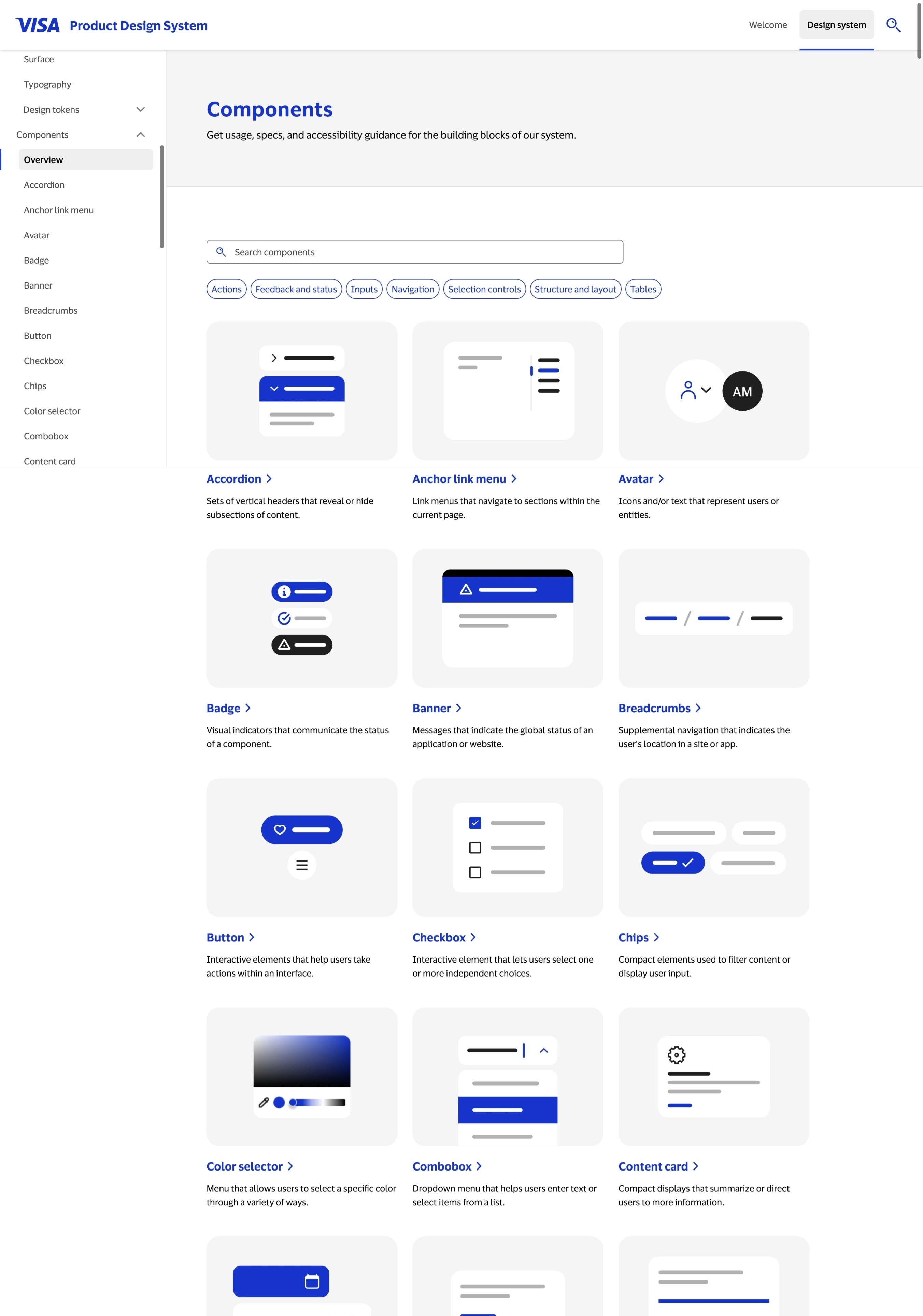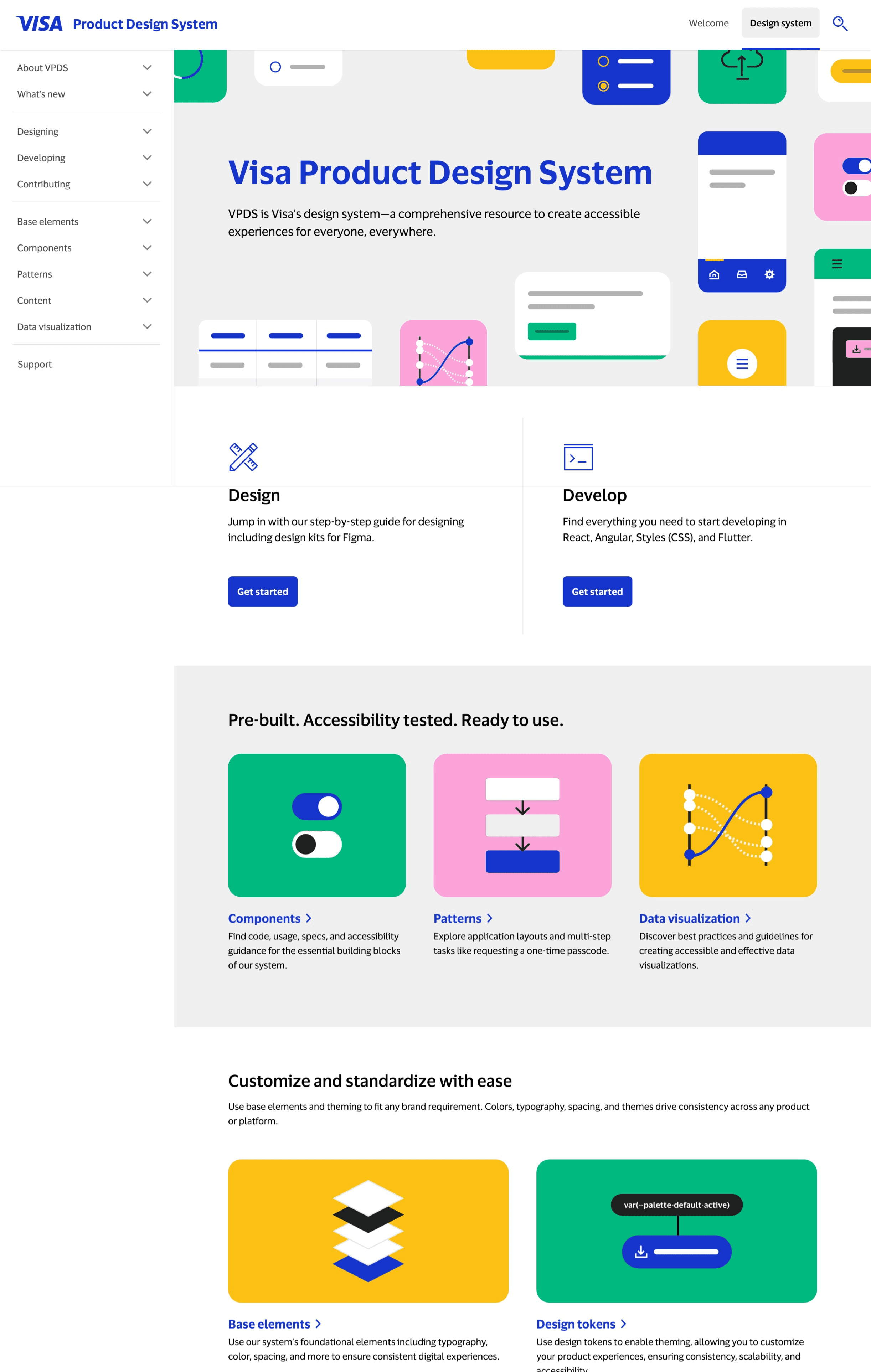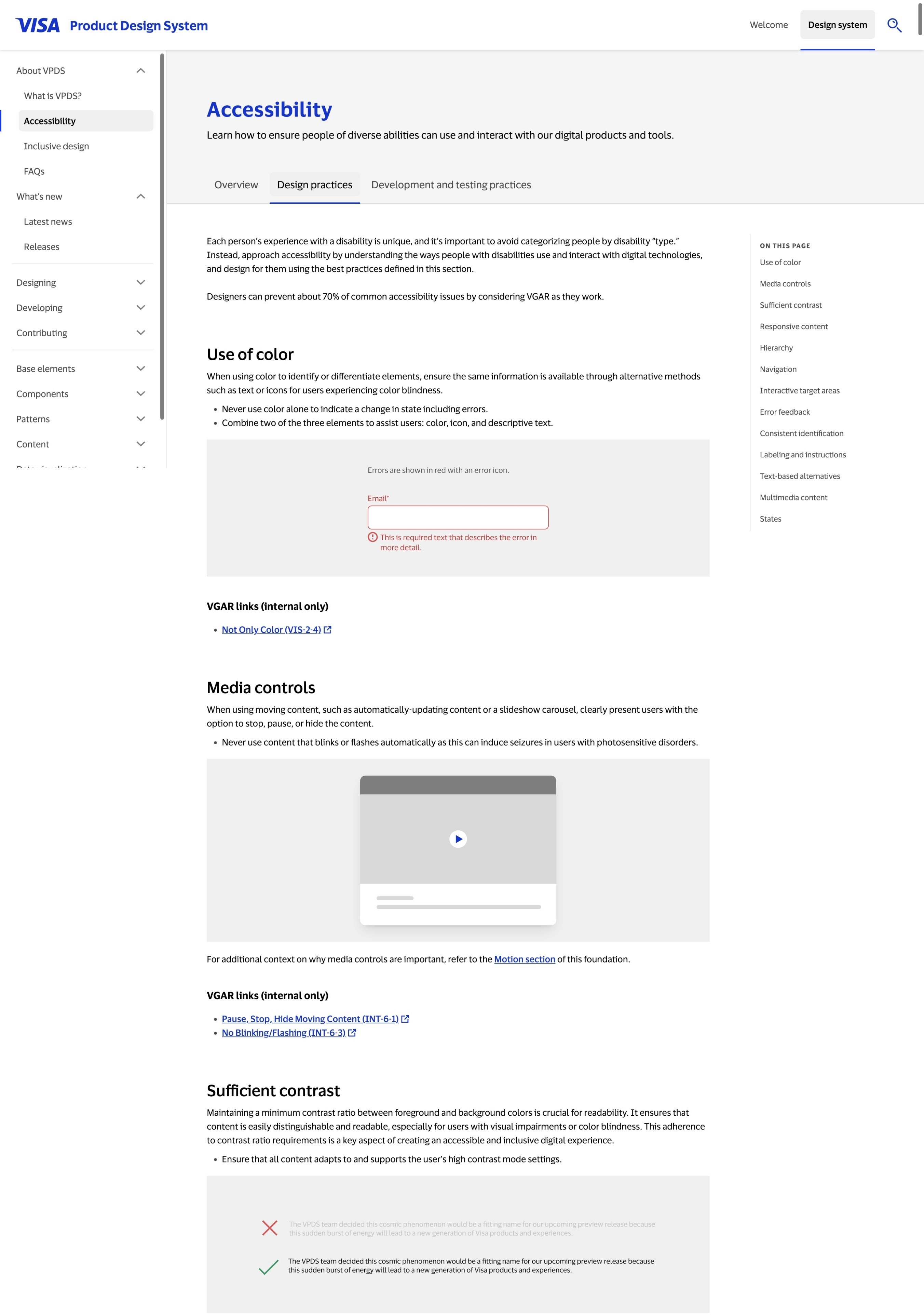 Visa Product Design Systems (VPDS) is a comprehensive resource that enables teams to create accessible experiences for everyone, everywhere. By standardizing components, patterns, and guidance, VPDS helps product teams across Visa deliver consistency and accessibility at scale. Our focus wasn't just on checking for compliance, but more about making accessibility guidance discoverable, usable, and truly embedded in how Visa designs .